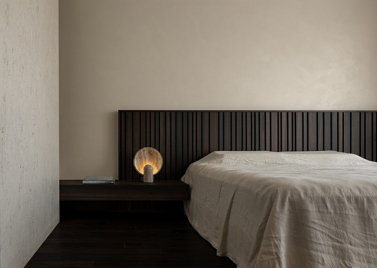 The master bedroom uses warm neutrals and clean lines to create a restful space. Built-in storage keeps the room clutter-free. Minimalist lighting enhances the calm atmosphere.