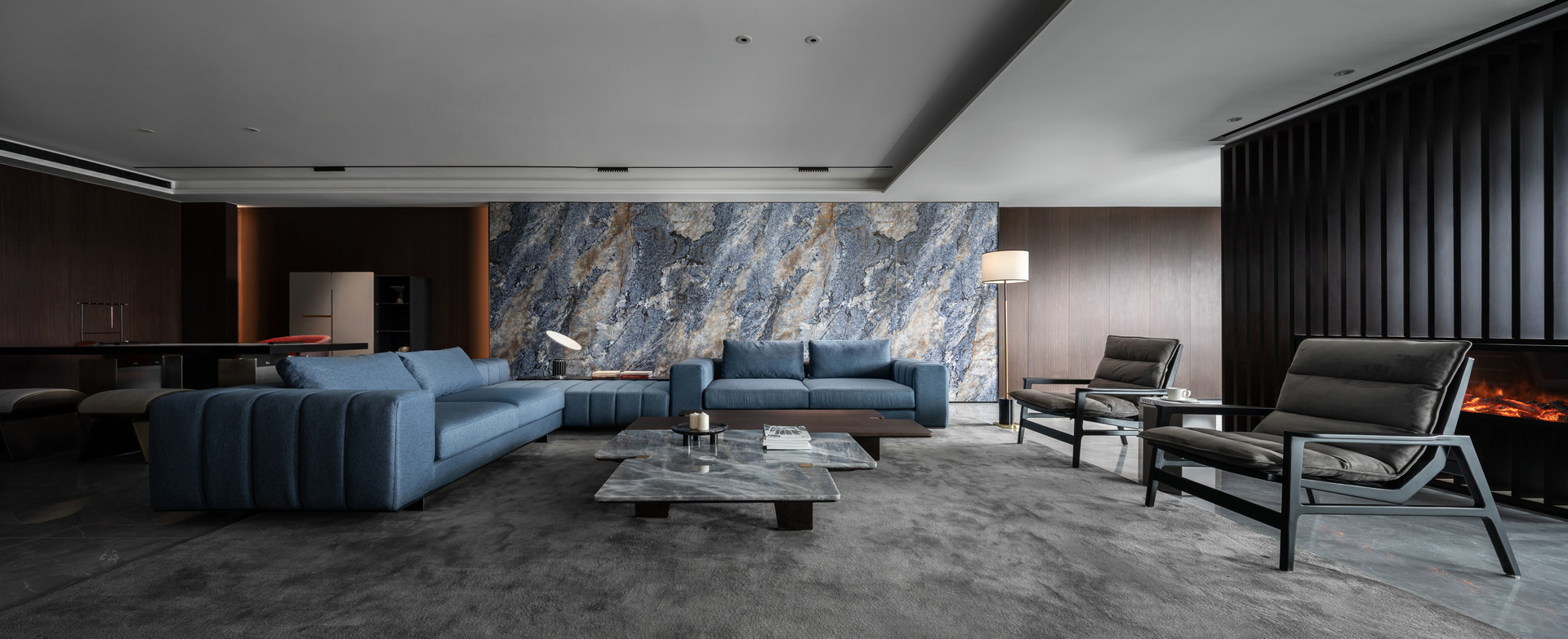 The extended frontage brings in generous daylight. Large-format furniture, premium fabrics, and warm metallic accents highlight the modern luxury interior design intention. As a result, the living zone feels open yet intimate.