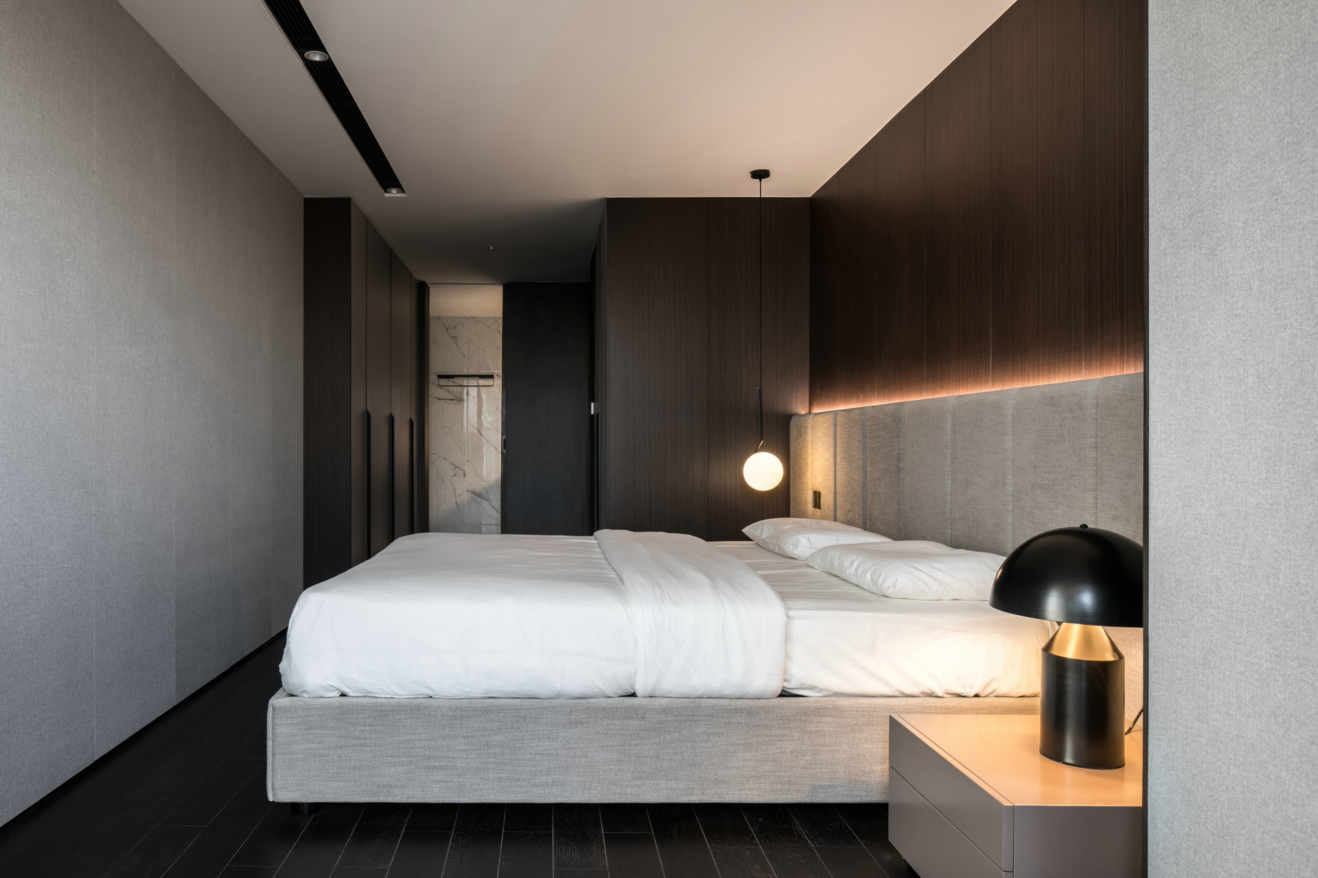 Each bedroom uses soft neutrals, layered lighting, and refined textiles. This creates a restful environment with subtle luxury cues. The master suite includes an elegant headboard feature, warm lighting, and practical wardrobe zoning.